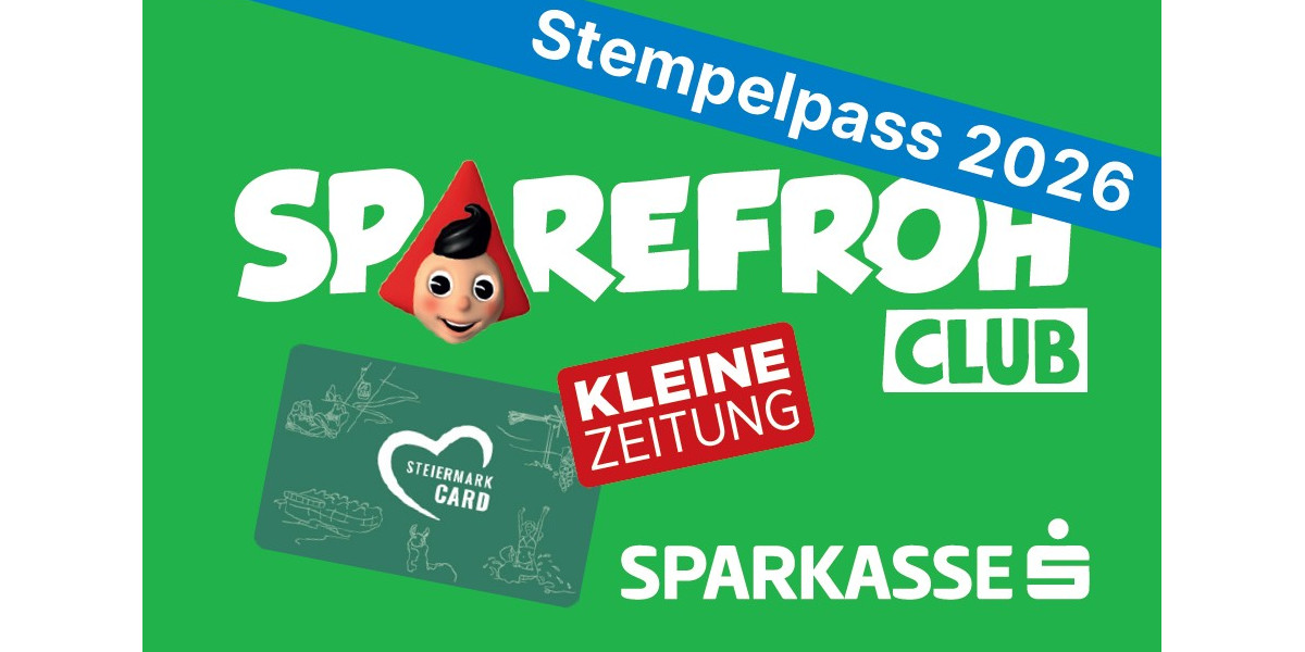 * Für 2 Erwachsene und max. 3 Kinder. Teilnahmebedingungen findest du auf deinem Sparefroh-Club-Stempelpass. Teilnahmeberechtigt sind alle Besitzer:innen einer Steiermark-Kinder-Card 2026 mit mindestens vier Stempeln im ausgefüllten Sparefroh-Club-Stempelpass. Die Sparefroh-Club-Mitgliedschaft ist nicht erforderlich.
